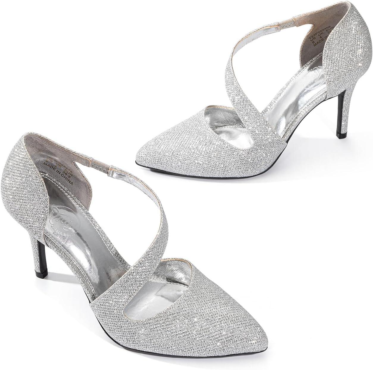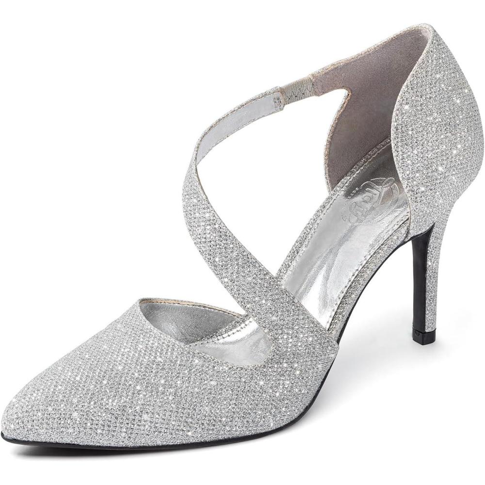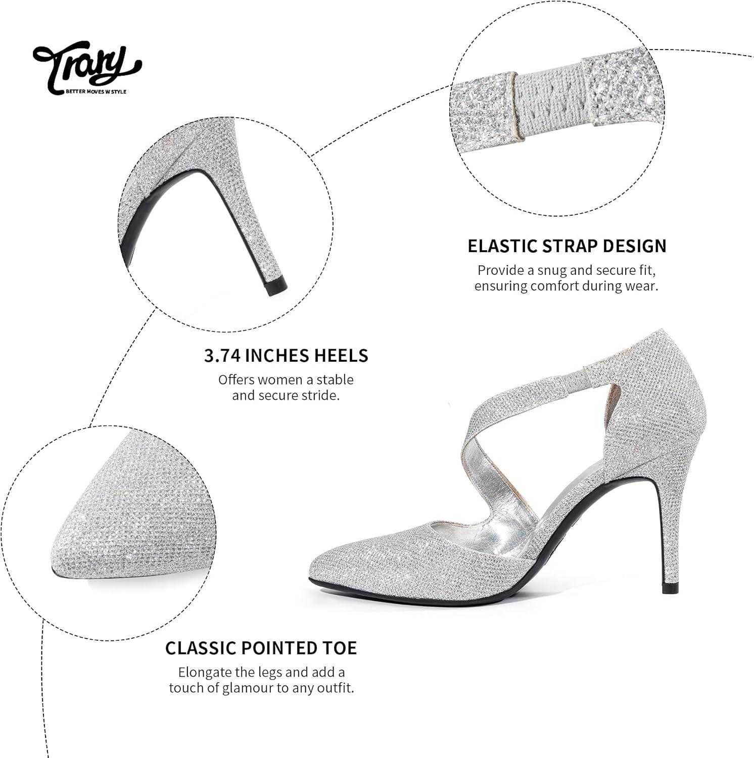 Trary Heels for Women Dress Closed Pointed Toe Stilettos High Heels Comfortable D’Orsay Pumps with Elastic Straps Sexy Slip On Shoes for Work Office Wedding Party(Glitter Silver)