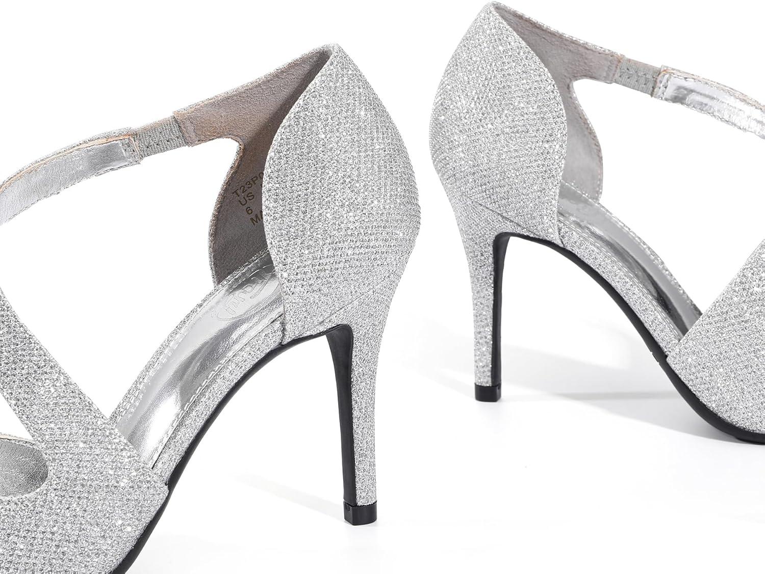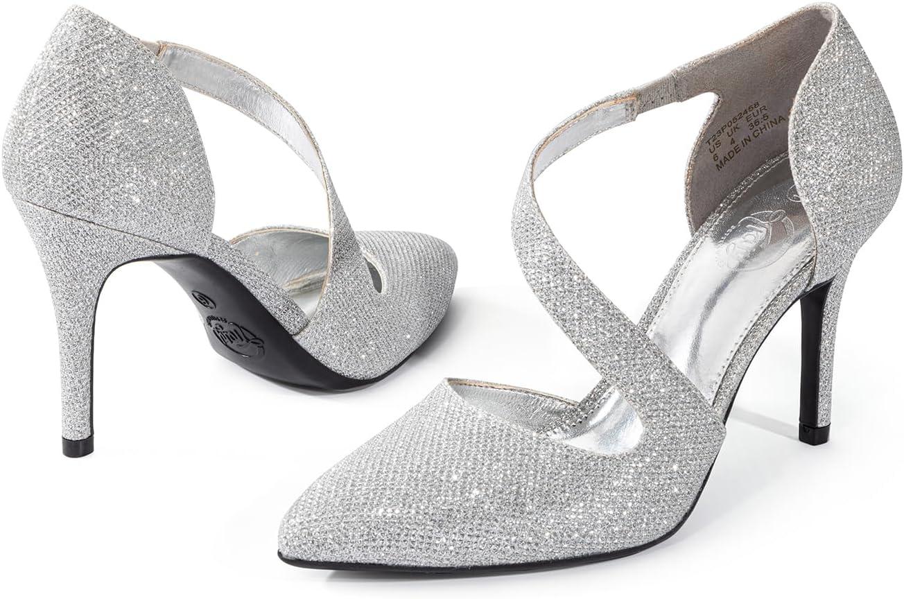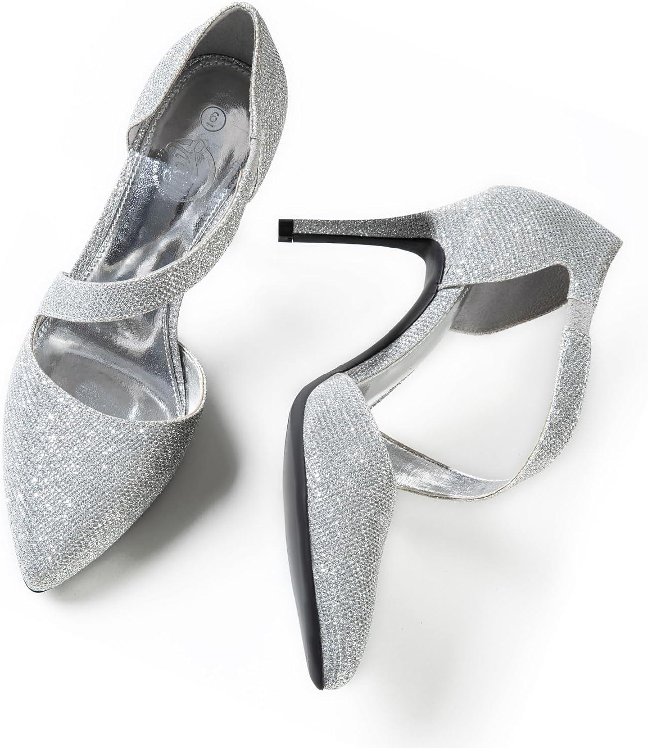 Trary Heels for Women Dress Closed Pointed Toe Stilettos High Heels Comfortable D’Orsay Pumps with Elastic Straps Sexy Slip On Shoes for Work Office Wedding Party(Glitter Silver)
