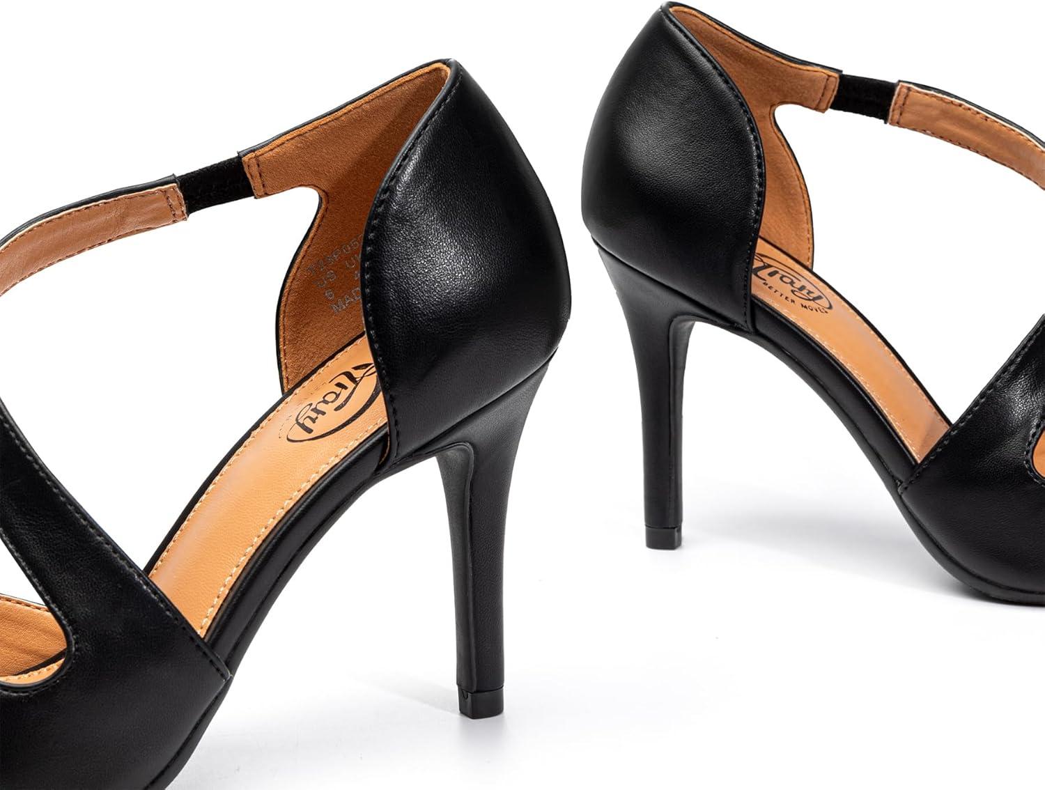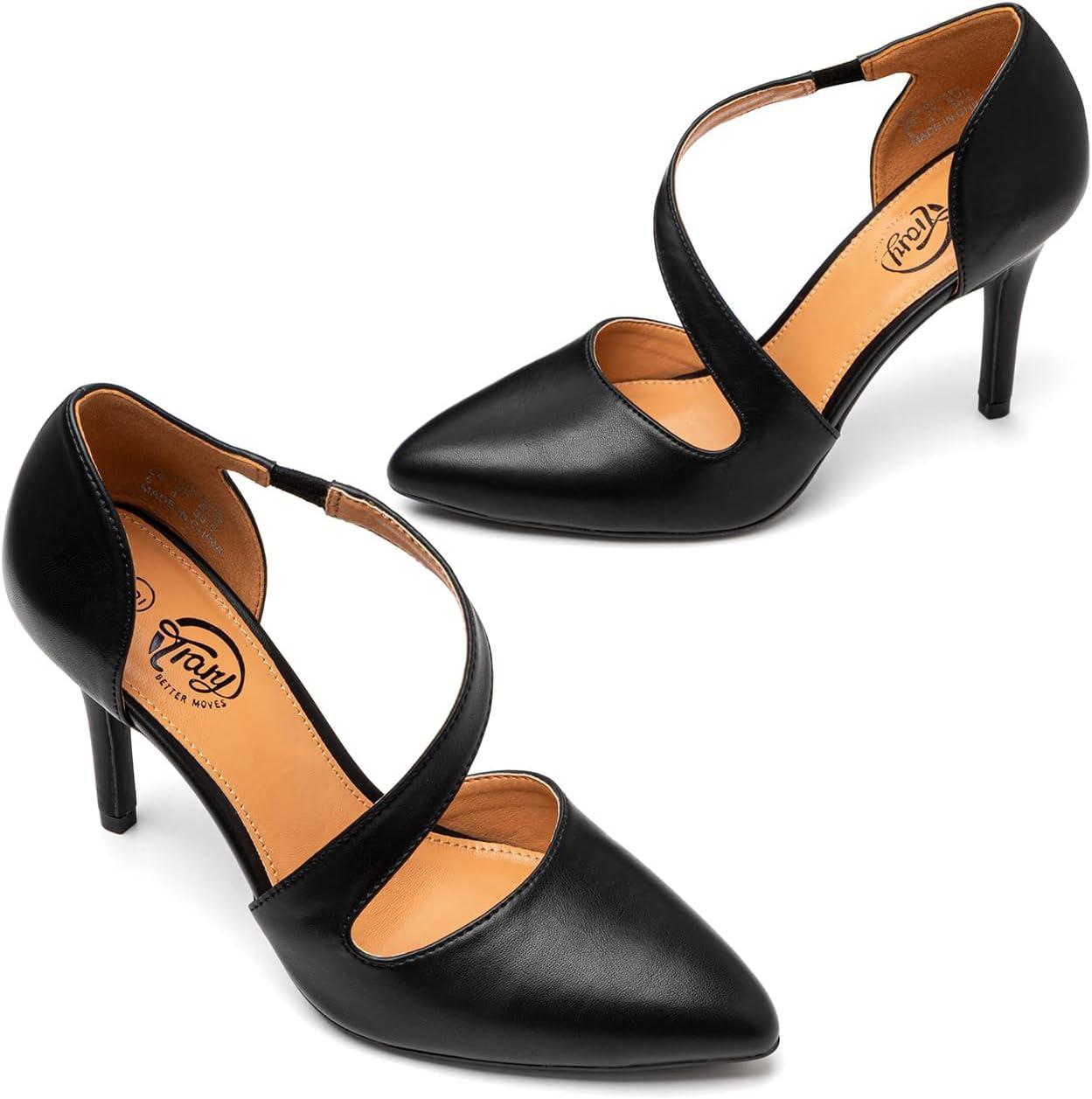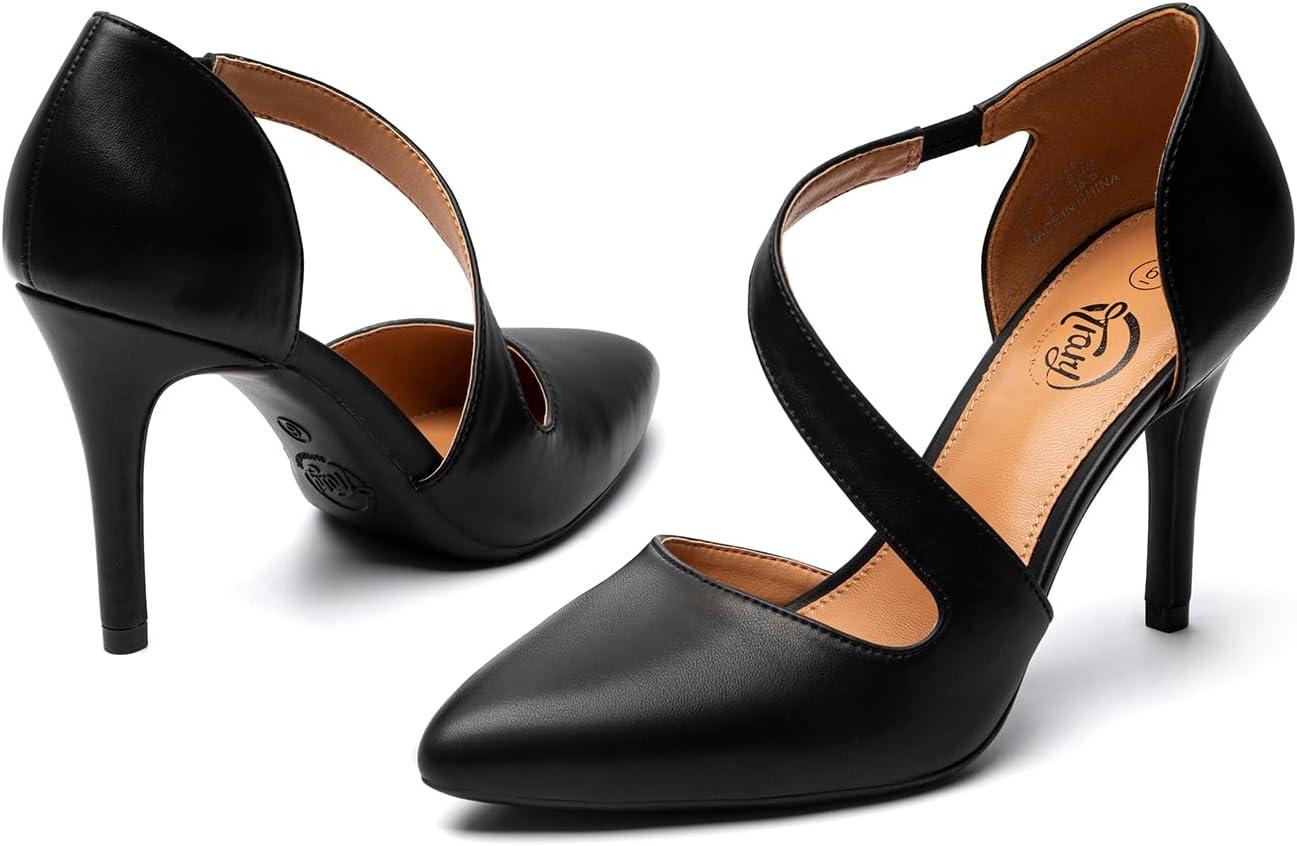 Trary Heels for Women Dress Closed Pointed Toe Stilettos High Heels Comfortable D’Orsay Pumps with Elastic Straps Sexy Slip On Shoes for Work Office Wedding Party(Pu Black)