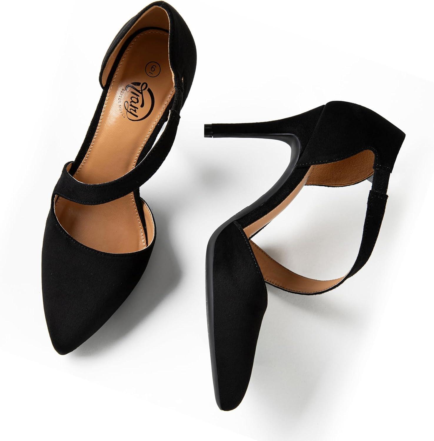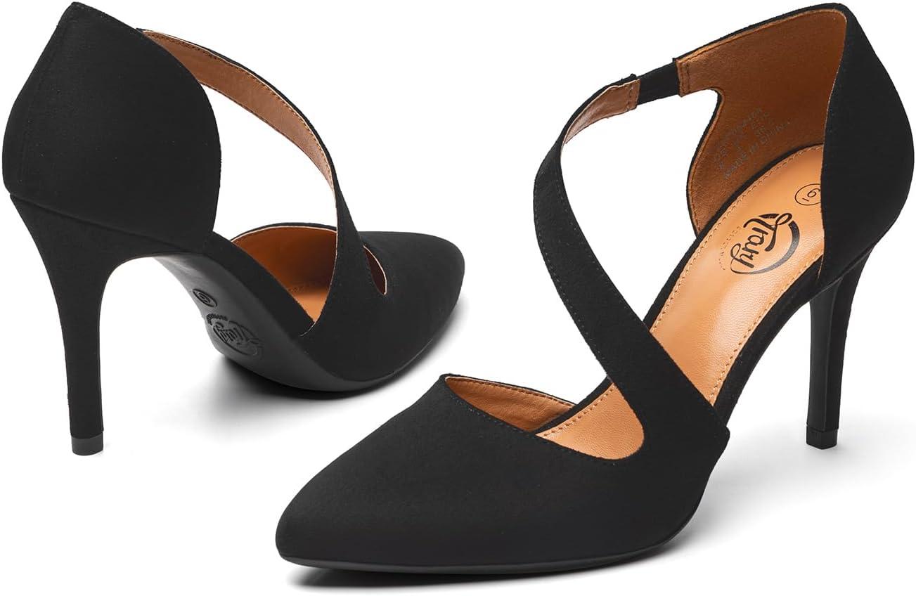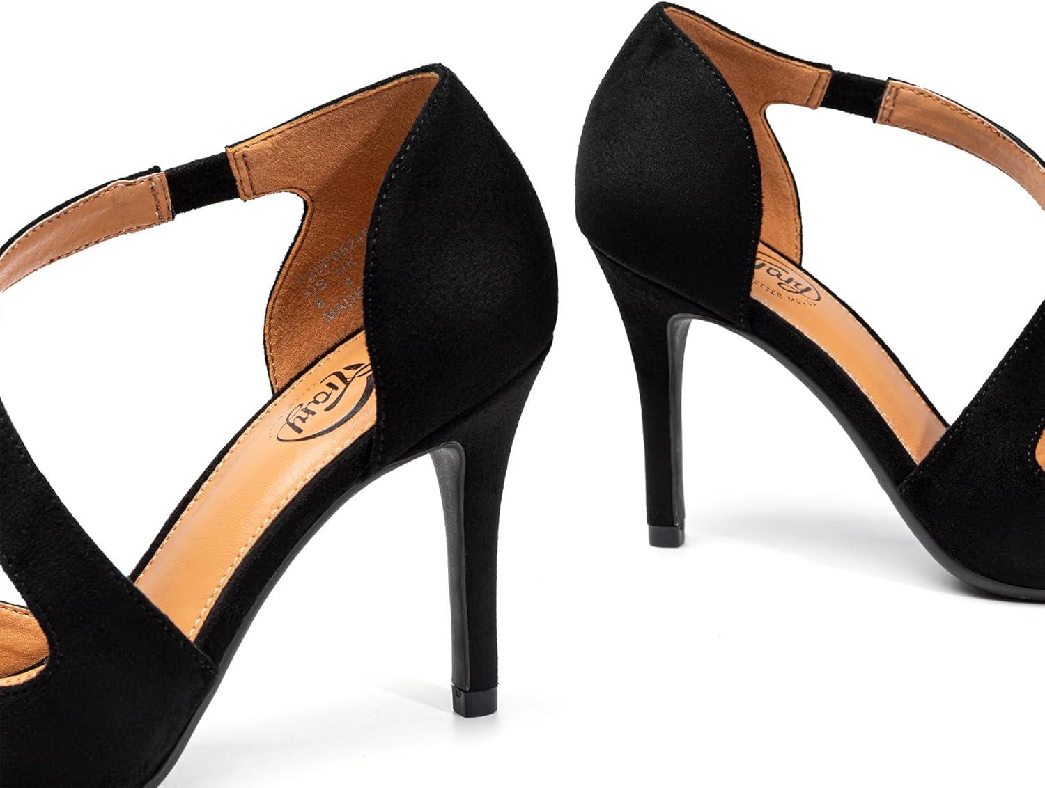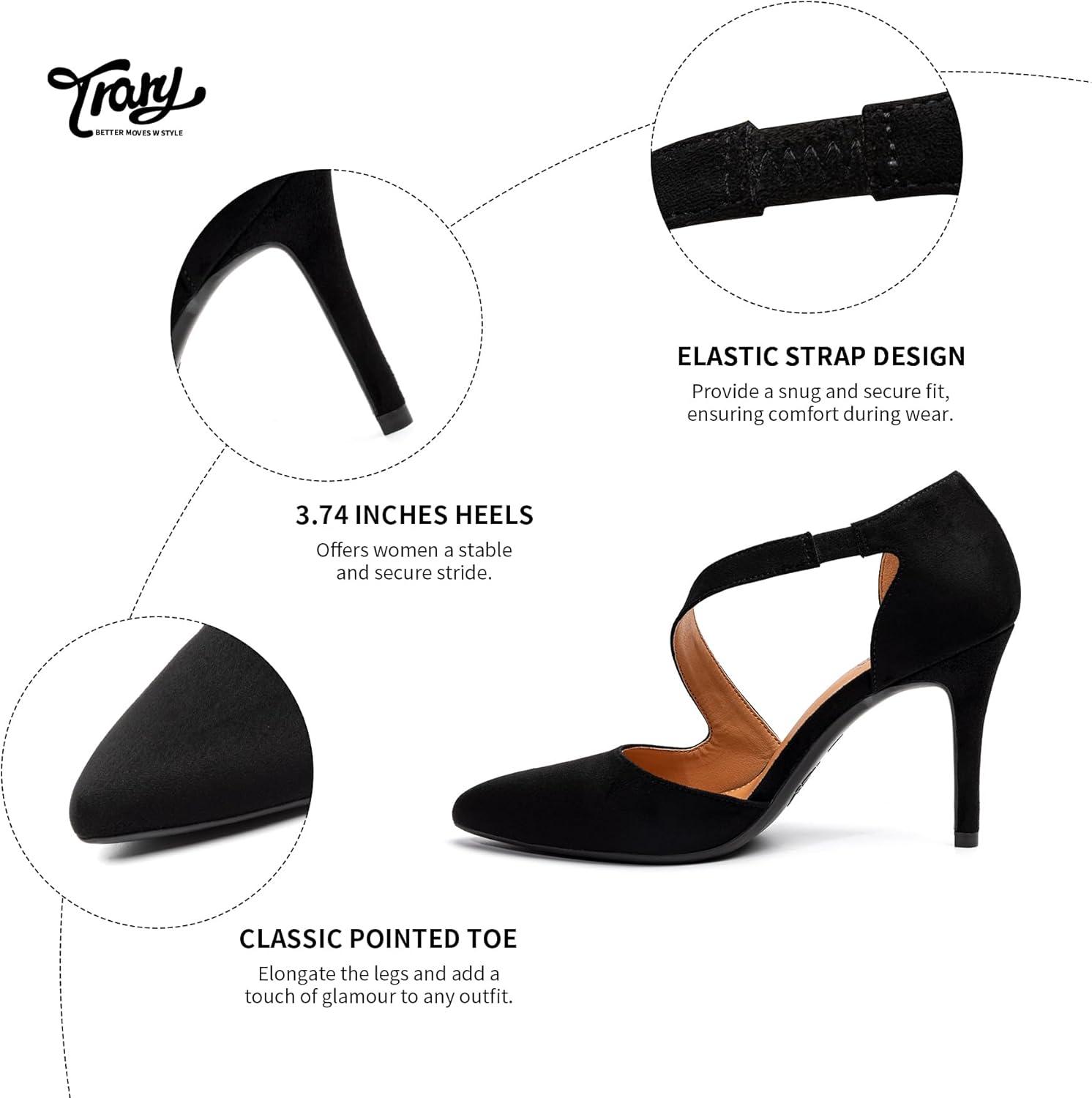 Trary Heels for Women Dress Closed Pointed Toe Stilettos High Heels Comfortable D’Orsay Pumps with Elastic Straps Sexy Slip On Shoes for Work Office Wedding Party(Suede Black)