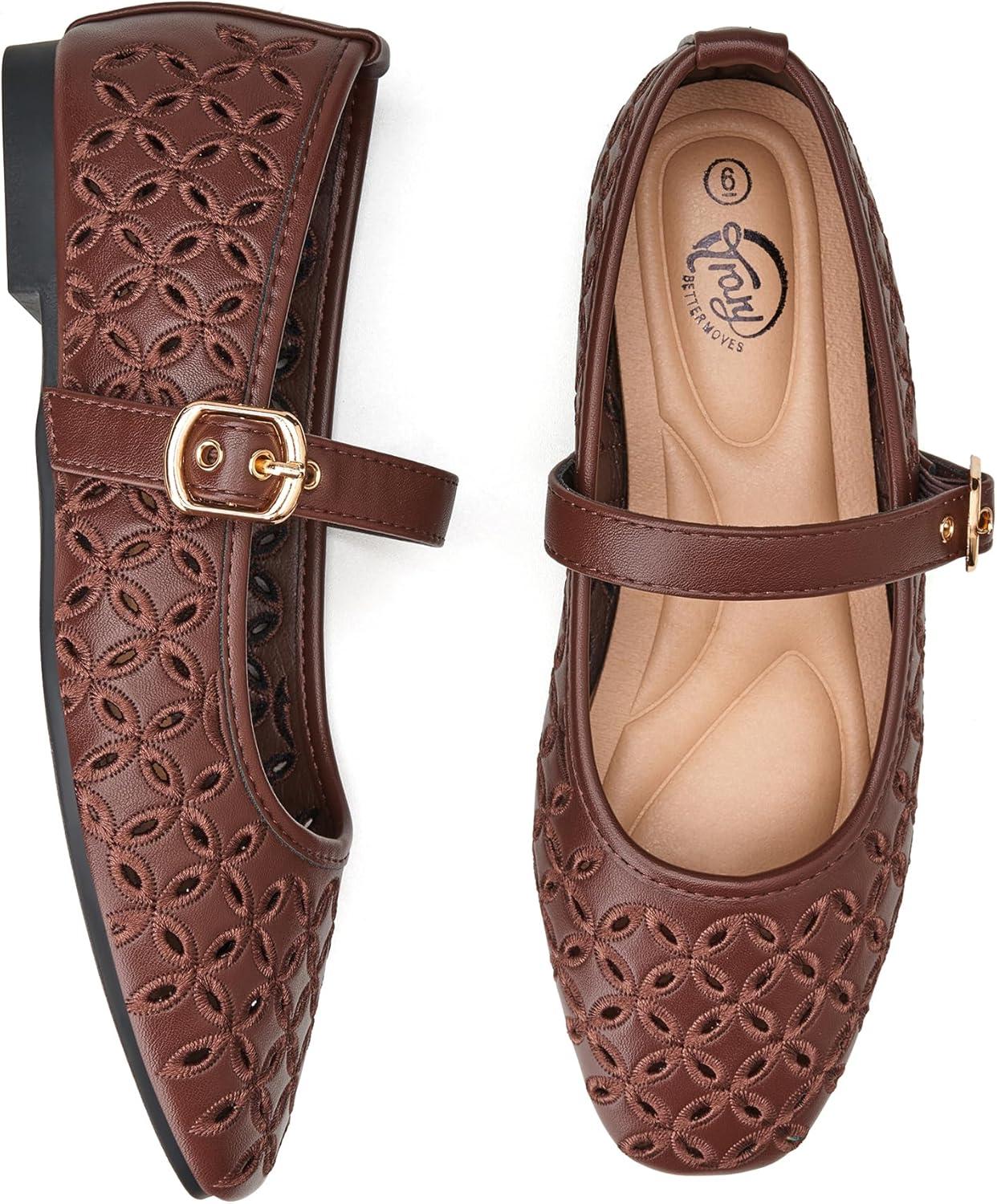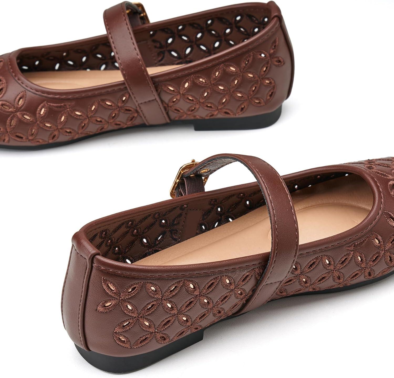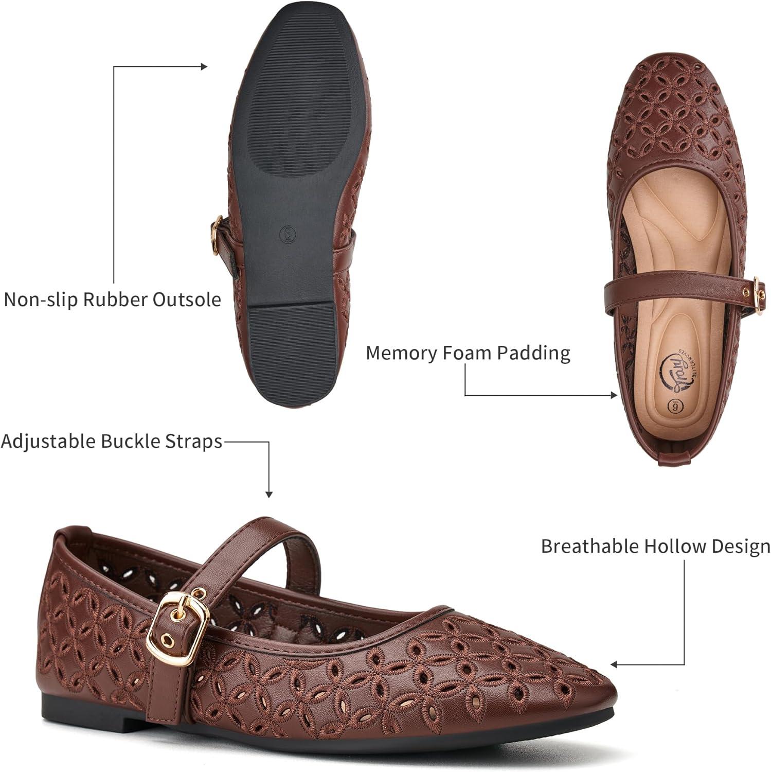 Trary Mary Jane Shoes Women, Hollow Flats for Women, Ballet Flats Shoes Round Toe Mary Jane Flats, Ankle Strap Flats Shoes Dressy Comfortable(Coffee)