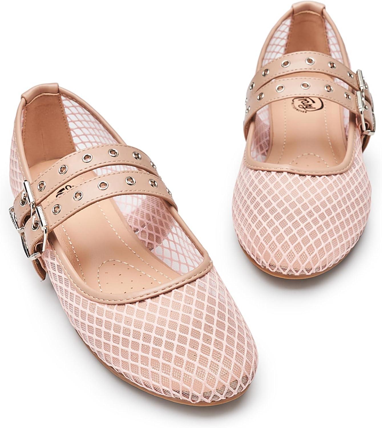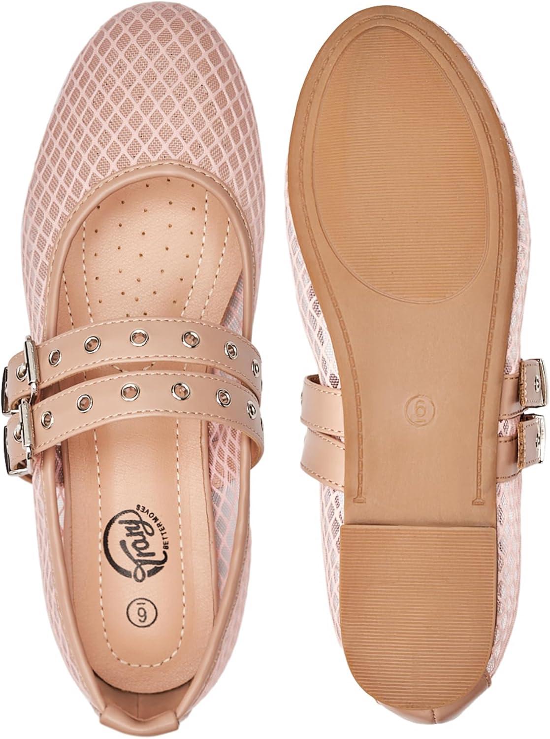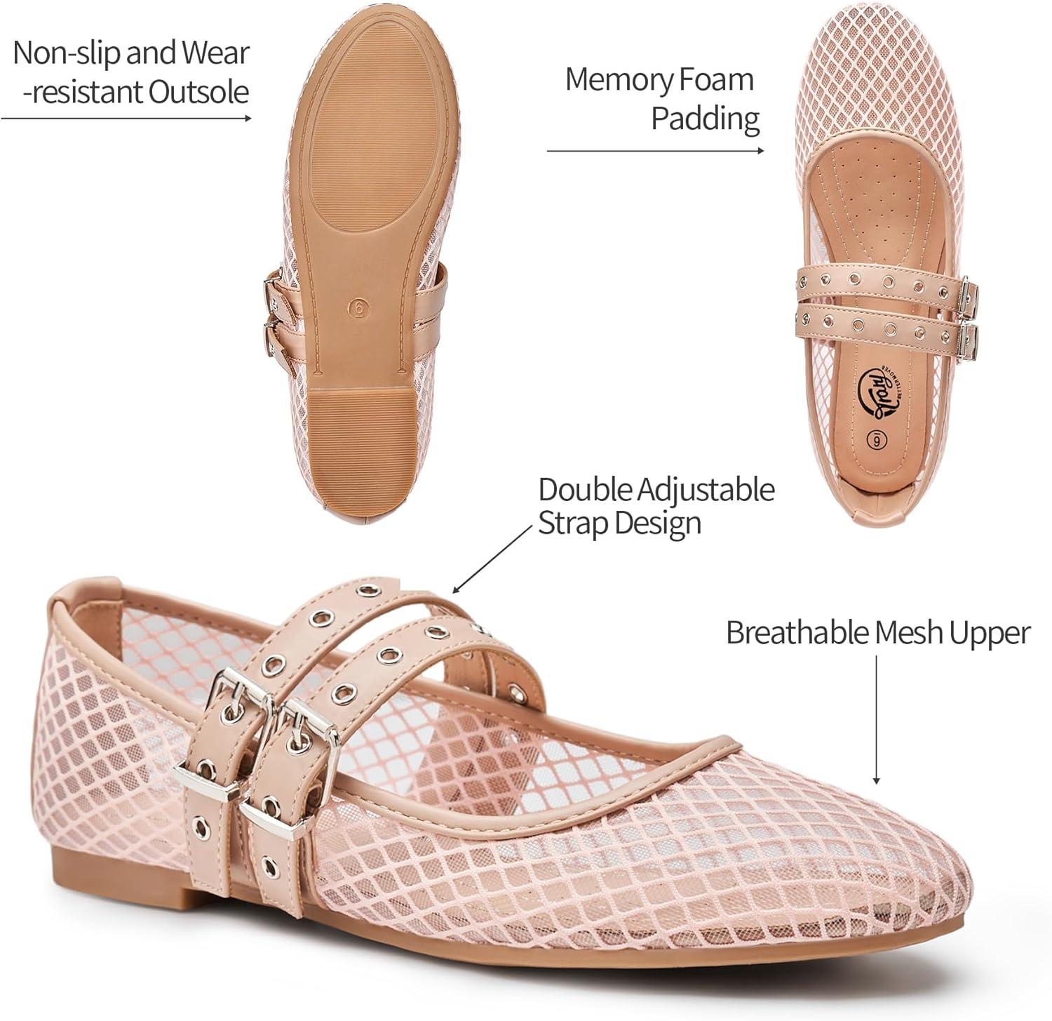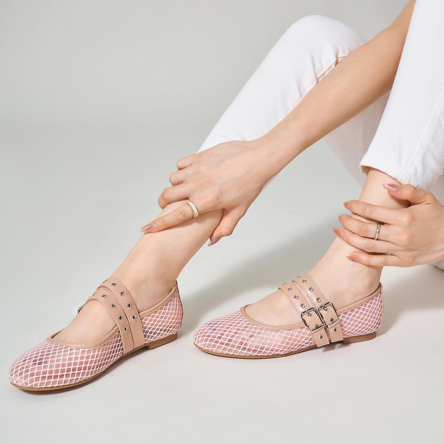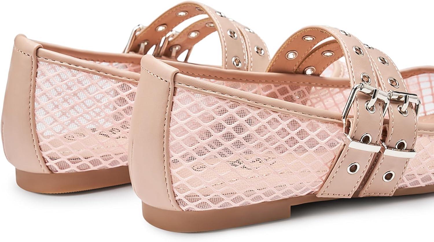 Trary Mary Jane Shoes Women Square Toe Flats for Women Dressy Ballet Flat Mary Jane Flats with Buckle Strap Comfortable Slip On Casual Shoes(Mesh-nude)