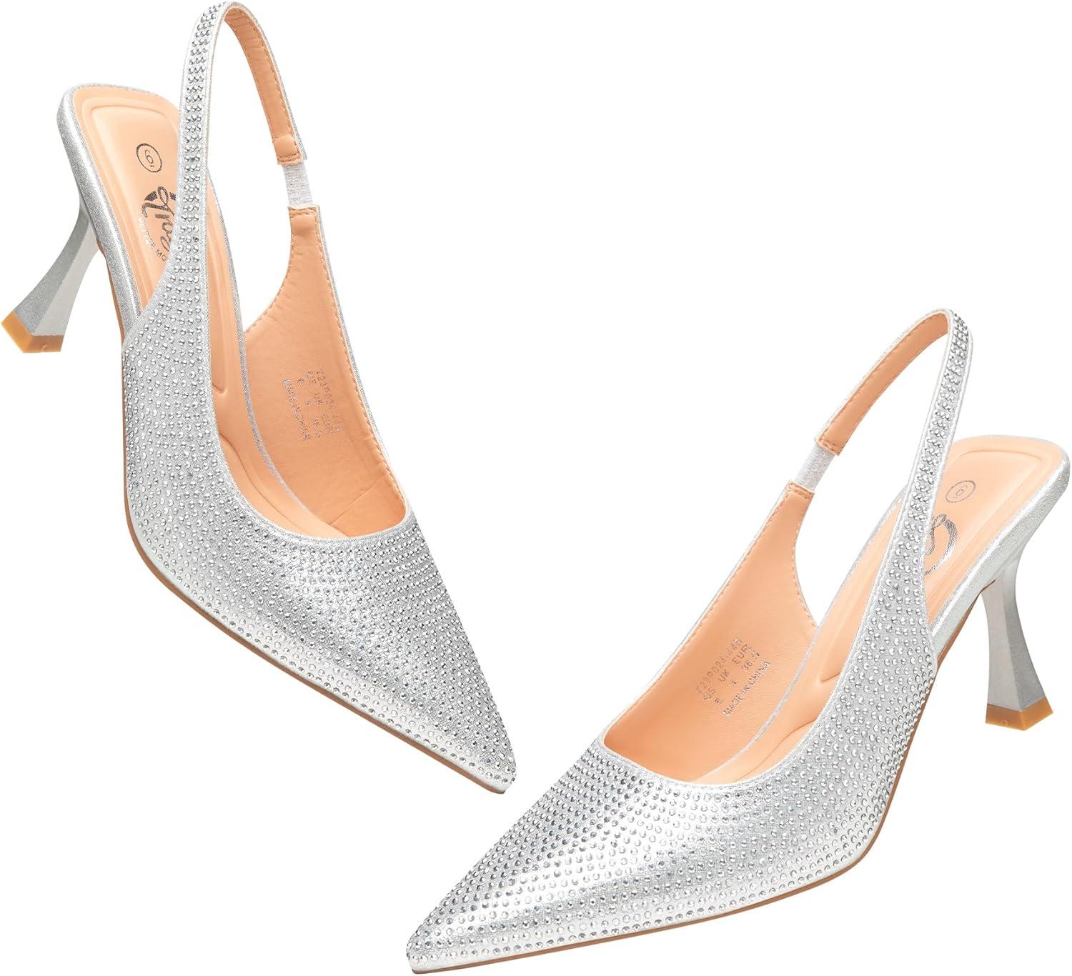Trary Slingback Heels for Women – Pointed Toe Pumps, Comfortable & Stylish for Parties & Work – 3.2inch High Heels, Rhinestone & Glitter Dressy Shoes(Silver)
