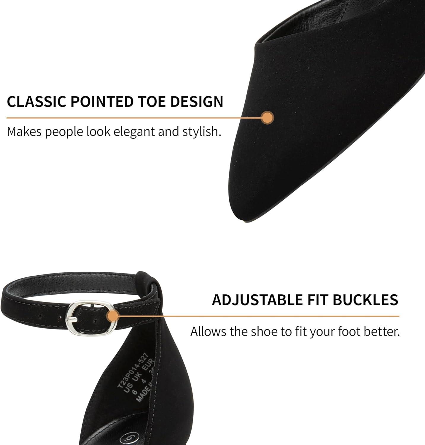 Trary Women’s Black Mary Jane T-Strap Ballet Flats, Pointed Toe, Comfortable, Adjustable Buckle, Business Casual, US Size 7-12(Black Suede)
