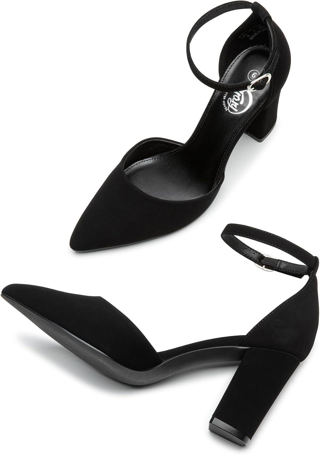 Trary Women’s Pointed Toe Pumps,Ankle Strap Buckle Closed Toe Chunky Block Heel Pumps,Dress Office Wedding Party Shoes for Women(Black Nubuck)